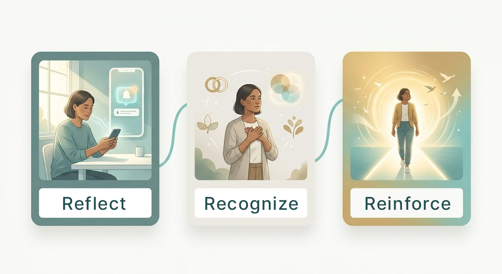 Each reflection takes 30–60 seconds, works on any phone, tablet, or computer, and requires no download.